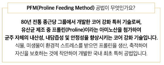 종근당 락토핏 생유산균 코어 제품이 바로 프롤린 공법을 사용한 제품입니다. 80년 전통 종근당 그룹에서 개발한 PFM 공법을 사용하여서 유산균이 위산과 담즙을 더욱 잘 버틸 수 있도록 만들어진 제품이라고 해요!
