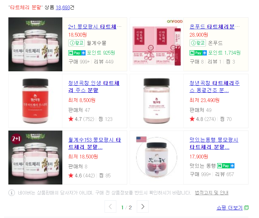 타트체리는 수확하면 바로 무르기 때문에 생과로는 먹기 힘들어서 많은 분들이 분말로 섭취하는 추세인데요, 네이버나 다음과 같은 포털사이트에 타트체리 분말을 검색하시면 많은 제품이 판매되고 있습니다. 제품이 너무 많아서 어떤 제품을 골라야 할지 고민이신 분들은 다음과 같은 기준을 참고하시면 좋을 것 같아요