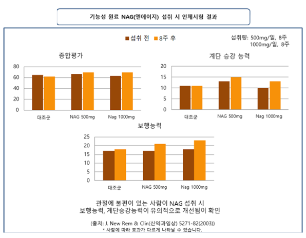 기능성 원료 NAG 인체적용시험 결과 관절의 불편함이 개선되었고 보행 능력, 계단 승강 능력 모두 개선이 된 것을 확인할 수 있었어요.