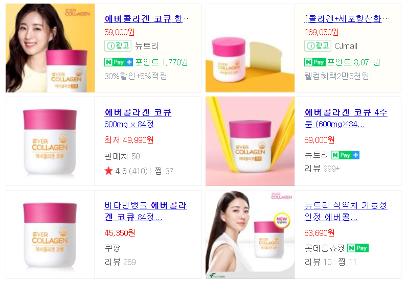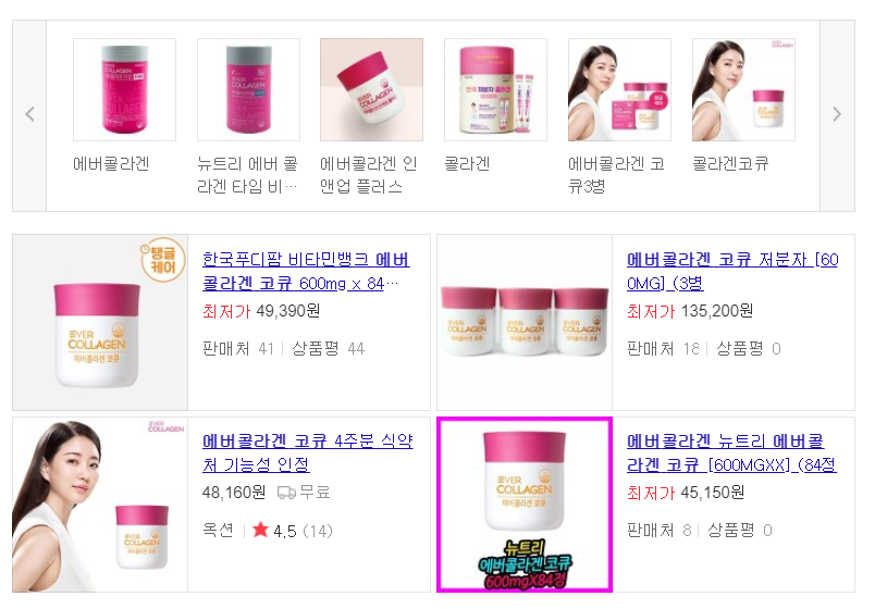 에버콜라겐 코큐는 제가 검색해보니까 84정(4주분) 기준으로 45,000원 정도의 가격이 가장 저렴했어요!