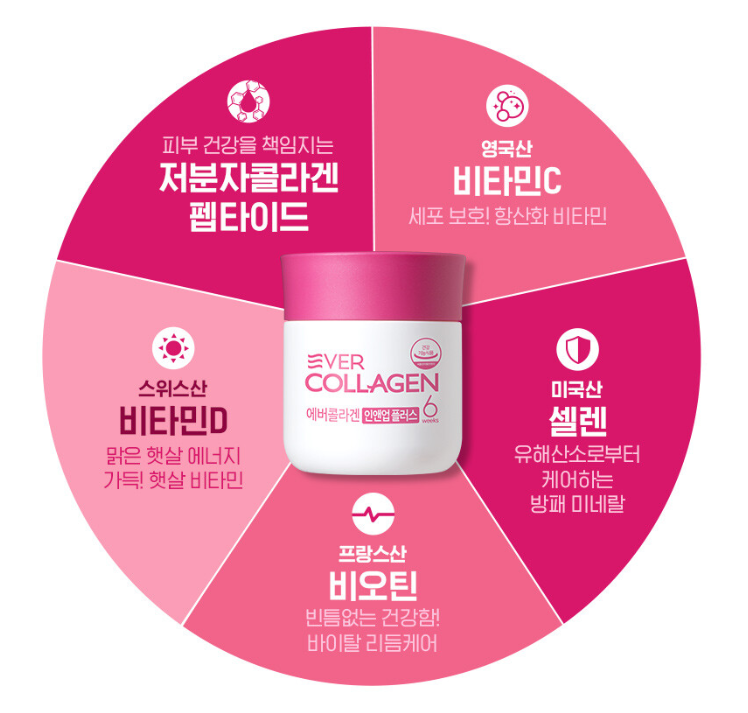 이밖에도 에버콜라겐 인앤업 플러스에는 비타민C, 비타민D, 비오틴, 셀렌 4가지의 성분이 1일 권장 섭취량의 100% 이상이 함유되어 있어서 따로따로 챙겨먹을 필요없이 이거 하나만 챙겨먹으면 될 것 같더라고요 :)