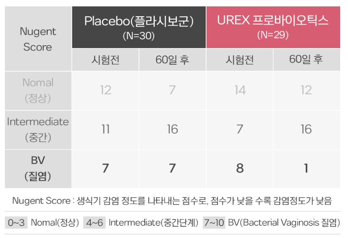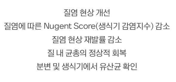 실제로 기능성 원료 UREX 프로바이오틱스에 관한 인체적용시험 결과를 진행하였더니 질염 현상 개선, 질염에 따른 Nugent Score 감소, 질염 현상 재발률 감소, 질 내 균총의 정상적 회복, 분변 빛 생식기에서 유산균 확인 등의 효과가 입증되었어요! 이밖에도 SCI 논문 포함, 12건의 인체적용시험과 세계적으로 다수의 연구 결과를 통하여 UREX 프로바이오틱스의 기능성이 과학적으로 확인되었습니다.