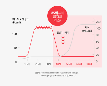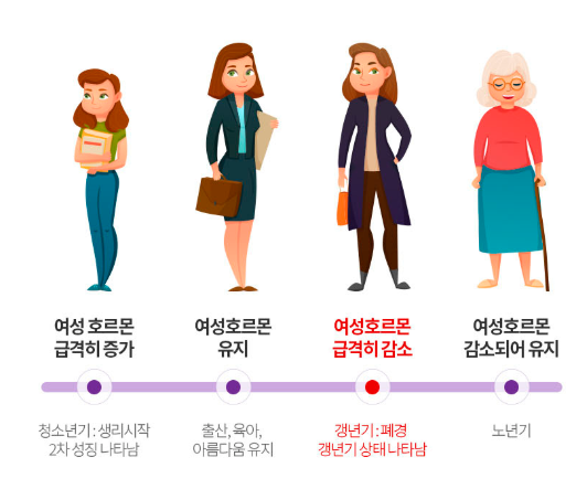여성의 대표적인 여성 호르몬인 에스트로겐은 난소 안에 들어있는 난포호르몬을 말합니다. 각자 개인차가 있지만 보통 45~55세 전후로 폐경에 접어들면서 여성 호르몬을 만드는 난소의 기능이 점차 줄어들게 되고, 이에 따라 여성호르몬인 에스트로겐도 급격하게 감소하게 됩니다.