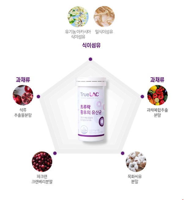 트루락 황후의 유산균은 유기농 아카시아 식이섬유, 밀 식이섬유, 석류 추출물 분말, 파크랜 크랜베리 분말, 과채복합 추출 분말, 목화씨유 분말 등의 부원료를 사용하여서 배변 활동과 여성 건강에 도움을 준다고 합니다. 프로바이오틱스(유산균)과 프리바이오틱스(유산균의 먹이)를 결합한 신바이오틱스로 장내에서 더욱 유산균이 성장할 수 있다고 해요!
