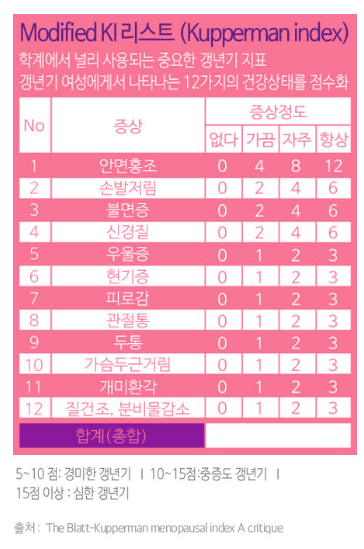 위에 표는 학계에서 널리 사용되는 주한 갱년기 지표로 갱년기 여성에게서 나타나는 10여 가지의 다양한 갱년기 건강 상태를 점수화한 것인데요, 5~10점은 경미한 갱년기 상태, 10~15점은 중증의 갱년기 상태, 15점 이상은 심한 갱년기 상태라고 합니다.