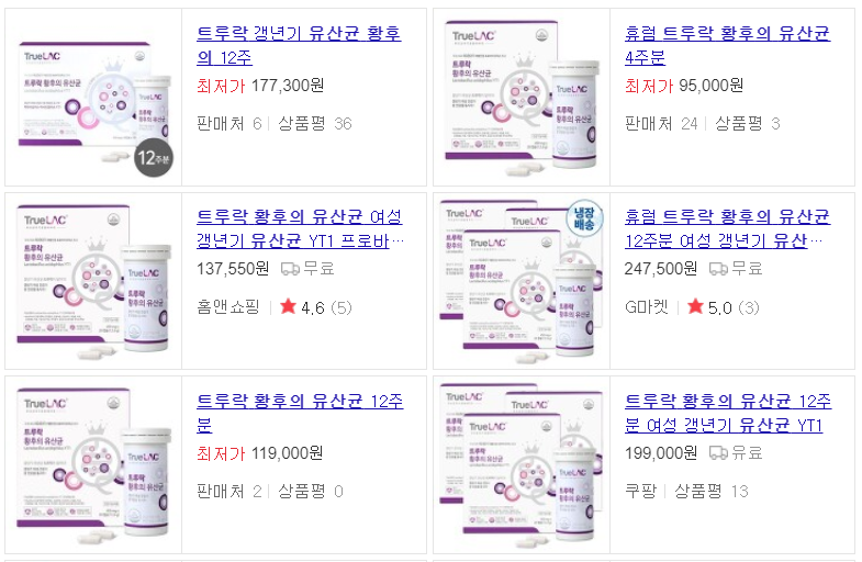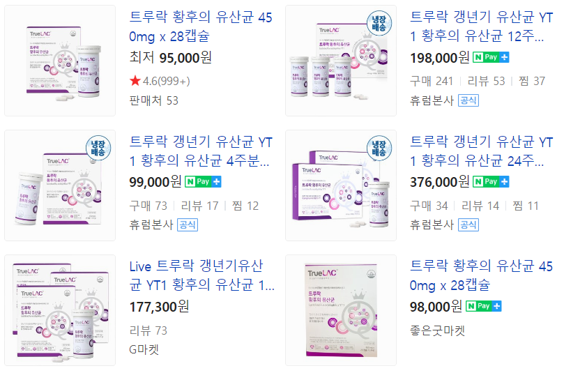 트루락 황후의 유산균은 현재 4주분 분량인 450mg x 28캡슐 기준으로 95,000원 정도의 가격이 가장 저렴했어요!