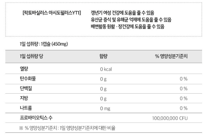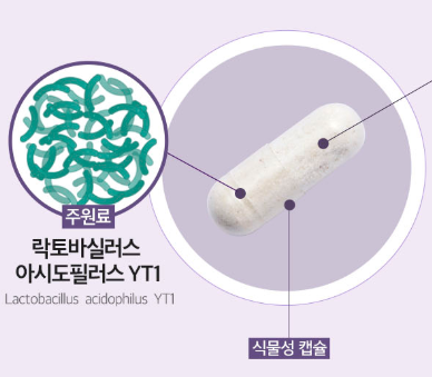 이 락토바실러스 아시도필러스 YT1 성분은 유산균 증식 및 유해균 억제, 장 건강은 물론 갱년기 여성 건강에 도움을 줄 수 있는 성분으로 YT1의 인체적용 시험결과 안면홍조, 손발저림, 신경과민, 우울증, 피로 등 총 10가지의 갱년기 증상이 유의적으로 개선되는 것이 확인 되었고, 갱년기 삶의 질을 평가하는 MENQOl 지수도 개선되는 것을 확인할 수 있었습니다.