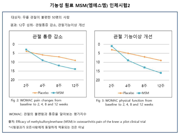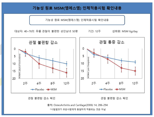 관절보궁 보의 주요성분은 MSM 성분이에요. MSM은 식약처로부터 관절과 연골건강에 도움을 줄 수 있음을 인정받은 성분이에요. 아래 자료를 보시면 무릎 관절이 불편한 성인 남녀 50명을 대상으로 한 인체적용시험인데요, 12주간 MSM 성분을 섭취하게 하였더니 관절 통증과 관절 불편함에서 유의미한 변화가 나타나는 것을 확인할 수 있었습니다.
