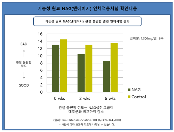기능성 원료 NAG 인체적용시험 결과 관절의 불편함이 개선되었고 보행 능력, 계단 승강 능력 모두 개선이 된 것을 확인할 수 있었어요.