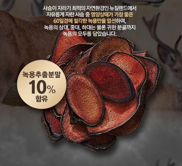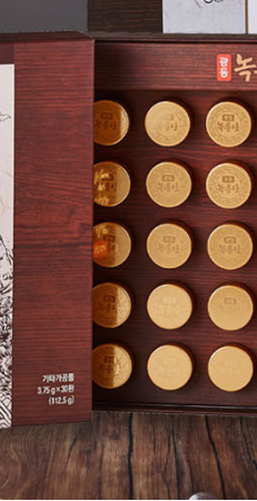 녹용은 숫사슴의 뿔을 잘라서 건조시켜 만들어집니다. 녹용은 항암효과, 혈관 건강, 아이들의 성장 발육, 원기 회복 등의 다양한 효능이 있습니다. 녹용에도 부위에 따라 효능의 차이가 있고 가격도 천차만별인데요 녹용단에는 최상단 부위로 가장 귀한 분골 부터 상대, 중대, 하대까지 모두 담았다고 합니다. 또한 분골의 영양상태가 가장 절정인 60일에 절각한 녹용을 사용하였습니다.