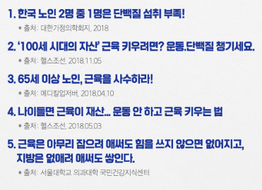 단백질은 3대 영양소 중 하나로 우리의 몸 속에서 수분 다음으로 가장 많은 성분이에요. 따라서 우리 몸 속에서 그만큼 많은 역할을 하고 있는데요, 대표적으로 근육의 형성 및 유지와, 소화, 혈액, 면역, 성장 등에 관여하고 있는 성분이에요. 하지만 우리의 몸은 나이가 들어가면서 단백질이 점점 감소하게 됩니다.