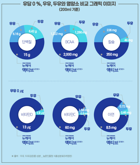 뉴케어 액티브 골든밸런스에는 단백질과 더불어 우리 몸을 위한 영양소가 함께 함유되어있는데요, 근육 합성에 꼭 필요한 필수 아미노산 BCAA 2,000mg와 뼈의 형성에 필요한 칼슘 350mg 그리고 19가지 미네랄과 비타민이 균형있게 들어있습니다.
