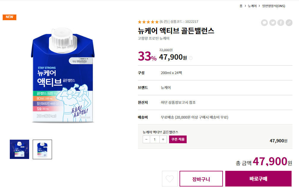 뉴케어 액티브 골든밸런스는 현재 대상 웰라이프 공식 홈페이지에서 200ml x 240팩 기준으로 47,900원에 판매하고 있었습니다!