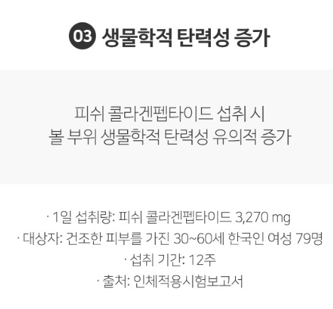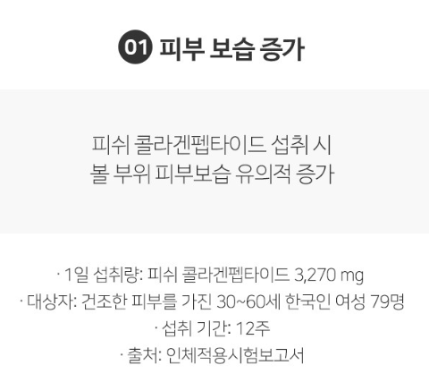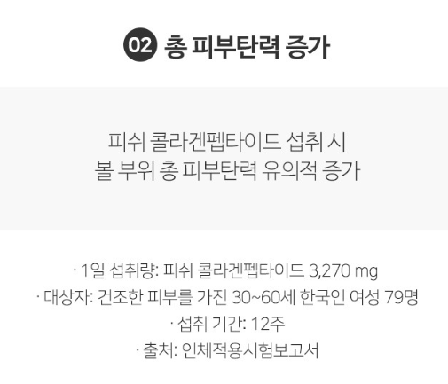 또한 저분자 피쉬 콜라겐펩타이드는 식약처로부터 기능성을 인정받기도 하였는데요, 인체적용시험 결과를 살펴보면 피부 보습 증가, 피부 탄력 증가, 주름 개선 등의 총 9가지 지표가 유의적으로 개선된 것을 확인할 수 있었어요!