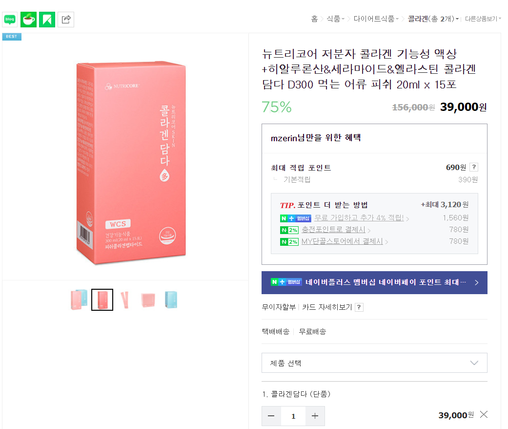 뉴트리코어 콜라겐 담다는 현재 뉴트리코어 공식 홈페이지에서 20ml x 15포 한 박스 기준으로 39,000원에 판매하고 있었어요!