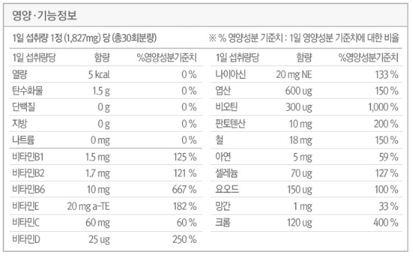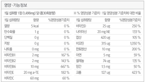 마이카일드는 1일 1정으로 14가지 비타민 미네랄과 27가지 유기농 야채의 과일 성분을 보충할 수 있는 멀티비타민이에요! 성분의 기능 정보는 아래와 같습니다.