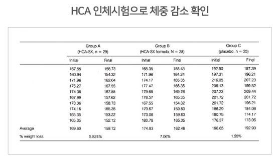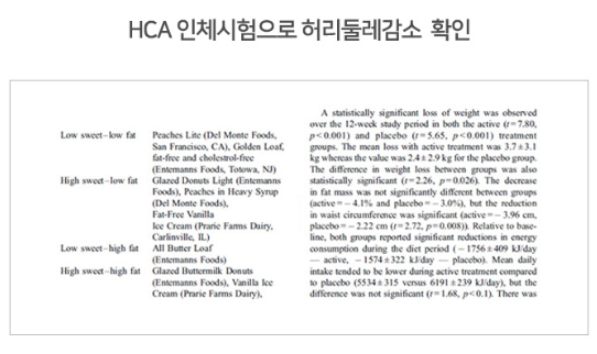 가르시니아캄보지아 추출물(HCA)의 인체적용시험 결과 체중 감소, 허리둘레 감소, 엉덩이 둘레 감소 등의 결과가 나타났다고 합니다.