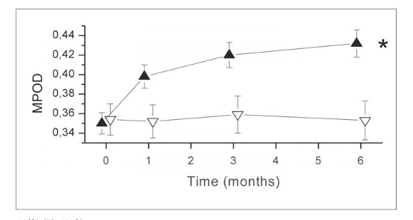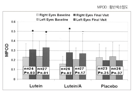 때문에 루테인을 섭취해주면 노화로 인해 감소될 수 있는 황반색소의 밀도를 유지하여 눈 건강에 도움을 줄 수 있습니다. 기능성 원료 마리골드꽃 추출물의 인체적용시험에서 루테인 섭취군의 황반색소 밀도가 더욱 높은 것을 확인할 수 있었습니다.
