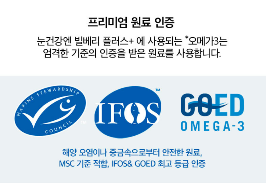 많은 분들이 오메가3를 섭취하실 때 걱정하는 부분이 중금속인데요, 빌베리 플러스는 엄격한 기준의 인증을 받은 원료를 사용하여서 해양 오염이나 중금속으로부터 안전하다고 해요!