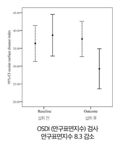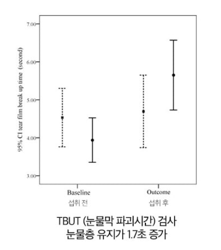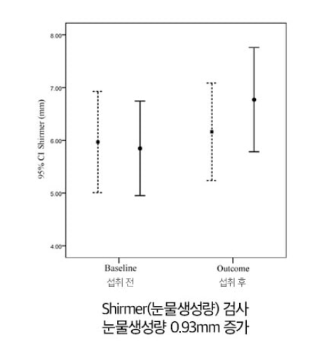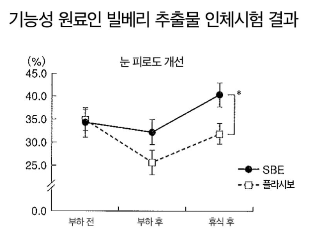 기능성 원료인 빌베리 추출물을 4주간 20~60세의 성인 30명을 대상으로 매일 160mg씩 섭취하게 하였더니 눈의 피로가 개선되는 것을 확인할 수 있었습니다.