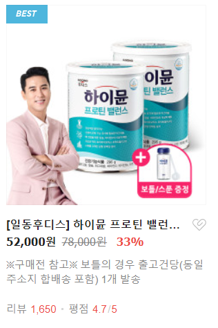 하이뮨 프로틴 밸런스는 현재 일동 후디스 공식 홈페이지에서 2캔에 52,000원에 판매하고 있었습니다!