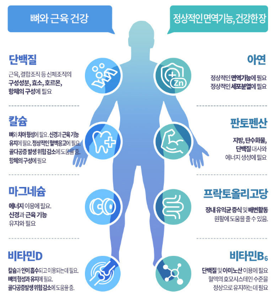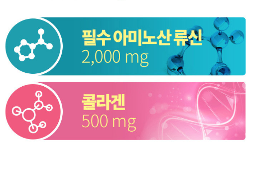 부원료로 필수 아미노산인 류신과 콜라겐을 사용하였고, 뼈와 근육 건강은 물론 정상적인 면역 기능과 에너지, 장 건강까지 고려하여서 단백질, 칼슘, 마그네슘, 비타민 D, 아연, 판토텐산, 비타민 B6 총 8가지의 영양소를 골고루 섭취할 수 있도록 영양 설계되었다고 해요.