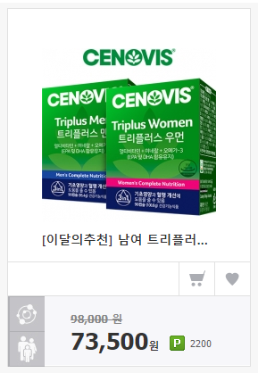 세노비스 트리플러스는 현재 공식홈페이지에서 90정 기준으로 49,000원에 판매하고 있습니다. 90정 x 2박스는 73,500원의 가격으로 좀 더 저렴하게 판매되고 있었어요!