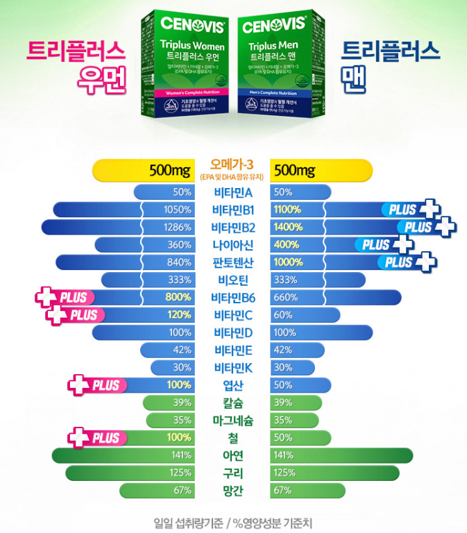 세노비스 트리플러스는 남성을 위한 제품과 여성을 위한 제품으로 나누어져 있습니다. 두 제품의 주요 성분은 오메가3, 각종 비타민과 미네랄 성분인데요 차이는 성분 함량 차이입니다!