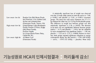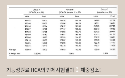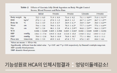 보통 우리가 영양소를 섭취하게 되면 일부는 활동을 위해 에너지로 쓰이고, 남은 영양소는 우리 몸에 비상에너지로 쓰이기 위하여 지방으로 저장되는데, 활동량이 적어지면 에너지로 사용되지 않고 체지방 형태로 저장되어서 살이 찌게 됩니다. 가르시니아는 탄수화물 섭취 시 지방으로 합성되는 것을 억제하여 체지방 감소에 효과적이라고 합니다. 아래 자료는 가르시니아 추출물(HCA)에 관한 인체적용시험 결과로 체중, 허리 둘레, 엉덩이 둘레 등이 감소하였고 피하지방, 내장지방을 포함한 체지방량을 감소시키는 것이 확인되었어요!