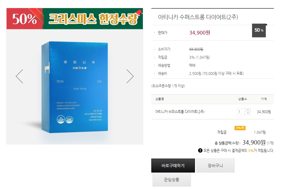 아티니카 수퍼스트롱은 현재 아티니카 공식 홈페이지에서 2주 치 기준으로 34,900원에 판매하고 있어요!