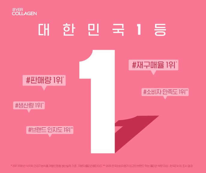 에버콜라겐은 현재 우리나라에서 브랜드 인지도, 판매량, 소비자 만족도 모두 1위를 달성하고 있는 콜라겐입니다. 에버콜라겐 코큐 제품은 현재 재구매율이 30%나 될 정도로 재구매율이 매우 높은데요, 한 번 구매해본 사람이 재구매를 했다는 것은 효과가 어느정도 검증이 된 제품이라고 생각이 드는 것 같습니다.