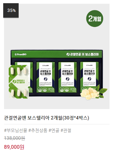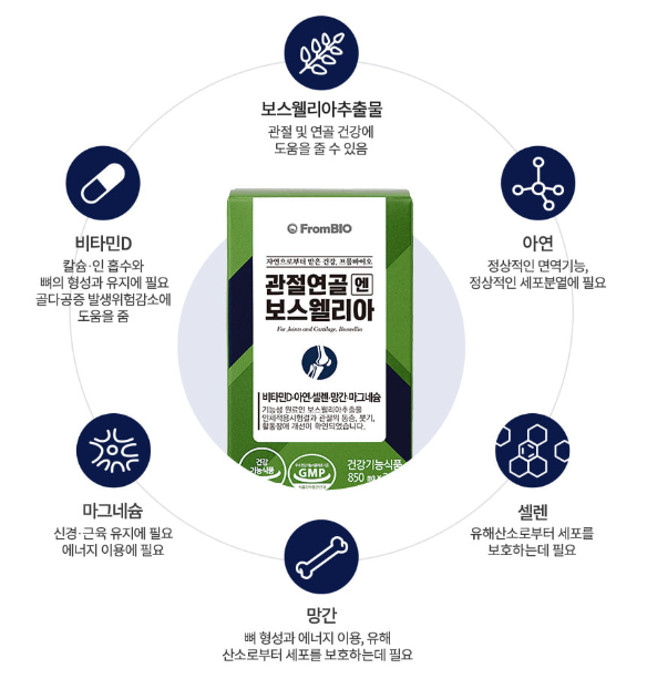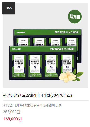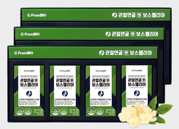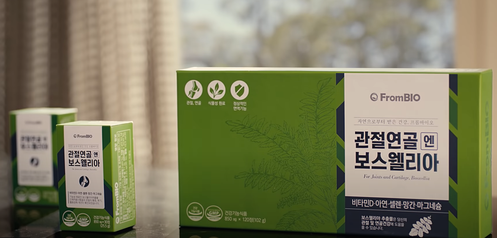 관절연골엔 보스웰리아는 프롬바이오에서 만들어진 관절 및 연골 건강에 도움을 줄 수 있는 건강기능식품입니다. 관절연골엔 보스웰리아는 런칭 후 다수의 홈쇼핑 방송을 통하여 매출 1,000억을 돌파하고 건강기능식품 브랜드파워 1위 등을 달성하면서 관절연골 건강기능식품 시장에서 대표적인 제품으로 자리 잡고 있는 것 같습니다.