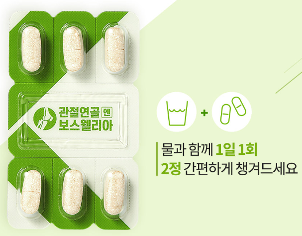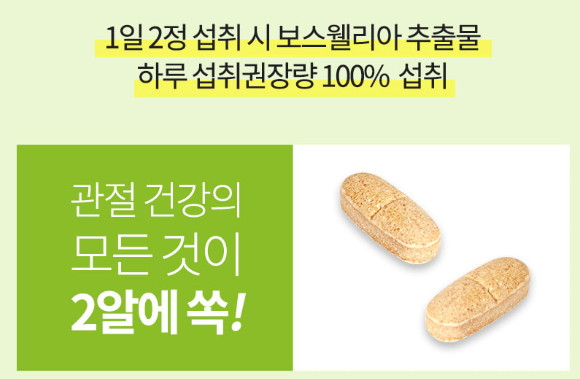 관절연골엔 보스웰리아는 하루에 한 번, 두 정을 식전 식후 관계없이 편하신 시간에 충분한 물과 함께 섭취하시면 됩니다. 1일 2정으로 보스웰리아 하루 권장섭취량 100%를 섭취할 수 있습니다!