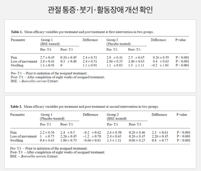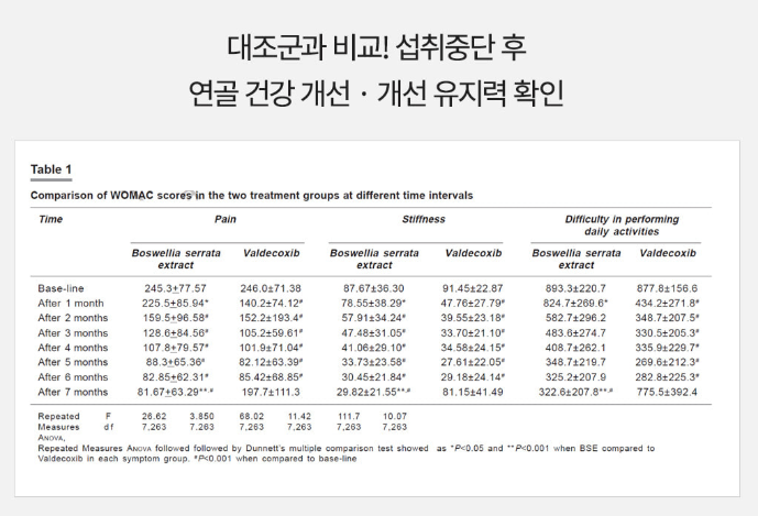 보스웰리아의 핵심 성분은 바로 보스웰릭산인데요, 이 보스웰리간 성분이 체내의 염증 유발 물질이 생성되는 것을 억제하고, 연골 기능의 유지를 도와서 관절을 튼튼하게 유지시켜준다고 합니다. 실제로 관절연골엔 보스웰리아의 주 원료로 사용된 보스웰리아 추출물을 45~72세 관절이 불편한 사람 30명에게 섭취하게 하였더니 관절 통증, 붓기, 활동 장애와 연골 건강이 개선되는 것을 확인할 수 있었습니다.