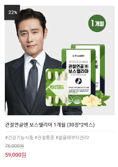 때문에 관절 건강을 위해서는 미리미리 꾸준한 관리가 필요합니다. 좋은 자세를 유지하고 적절한 운동 등과 함께 관절에 좋은 음식이나 영양제 등을 섭취하는 것이 도움이 될 수 있습니다. 오늘 소개드리는 이병헌관절약은 이병헌씨가 전속모델로 활동 중인 제품으로 관절 건강에 도움이 될 수 있는 제품이에요.