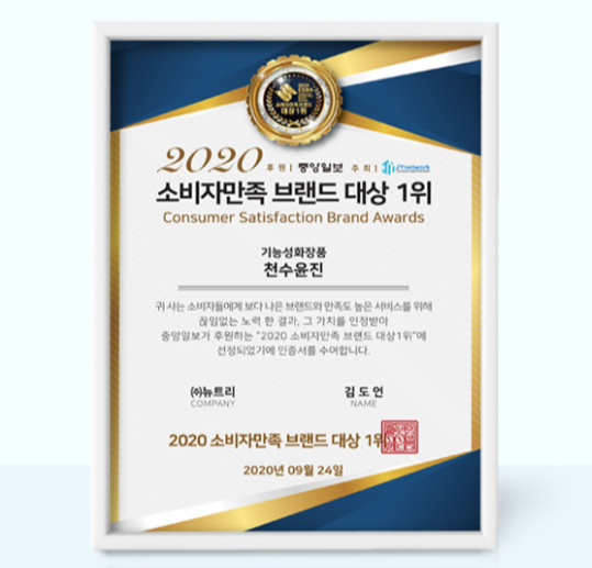 실제로 올해 실시한 소비자 만족도 설문조사 결과 천수윤진 제품 사용후 피부촉촉함 100%, 매끄러움 100%, 발림성95.8% 이상 등등의 좋은 평가를 바았고, 2020 소비자 만족 브랜드 기능성 화장품 부문 1위를 수상하기도 한 제품이에요! 요즘같은 겨울철에 더욱 건조해지기 쉬운 피부는 보습력 높은 에센스, 크림 제형의 화장품을 사용하는 것이 좋은데요,오늘 소개드리는 천수윤진 화장품은 뛰어난 보습력과 탄력 개선 등 피부 건강에 도움을 줄 수 있는 제품입니다. 천수윤진 크림, 에센스, 마스크팩의 효과와 가격 등을 총 정리해볼테니 꼼꼼히 읽어보시면 많은 도움이 될 것 같습니다 :)