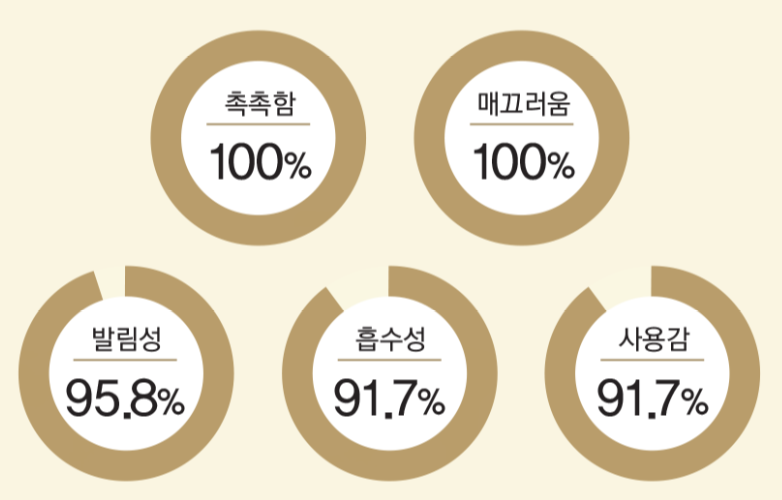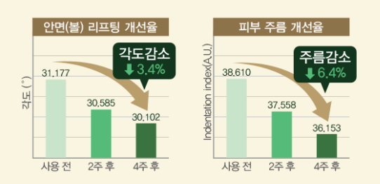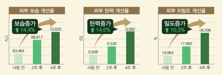 또한 적송 소나무잎 추출물과 검은서양 송로 추출물, 누에 추출물 등의 다양한 한방성분이 포함되어서 성분의 깊이감을 더해주고 매끄럽고 촉촉한 피부를 만들어주는데 도움을 준다고 합니다. 실제로 천수윤진에 관한 인체적용 시험을 살펴보면 피부 주름, 피부 보습, 안면 리프팅 개선, 피부 탄력, 피부 치밀도 등 전체적으로 피부 안티에이징에 도움을 주는 효과를 확인할 수 있었어요.