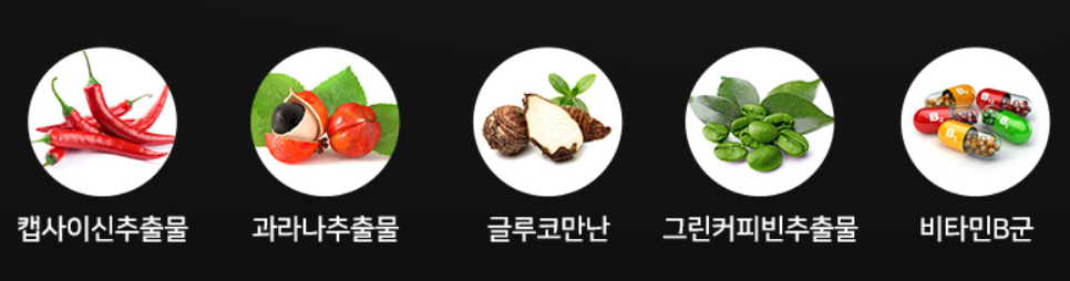 부원료로는 캡사이신추출물, 과라나추출물, 글루코만난, 그린커피빈추출물, 비타민B군 등이 사용되었는데, 혹시 해당 성분에 민감하신 분들은 섭취에 주의하시길 바랍니다.