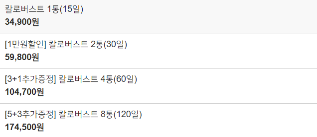 칼로버스트는 현재 프로 뉴트리션 공식 홈페이지에서 1통에 34,900원에 판매하고 있고 대량으로 사면 좀 더 저렴하게 구입할 수 있어요! 글의 작성 시기의 가격과 글을 보시는 시기의 가격이 차이가 날 수도 있기 때문에 직접 한번 더 검색해보시길 추천드립니다.