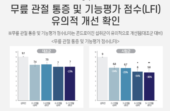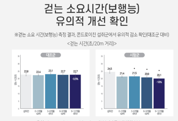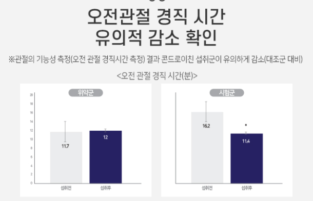 관절엔 콘드로이친 1200은 하루 2정으로 콘드로이친의 일일 권장 섭취량 1,200mg를 모두 충족시키고 있습니다. 인체적용시험을 통하여 무릎 관절 통증 및 기능평가 점수, 보행 능력, 무릎 관절 통증, 관절 평균 너비, 손 통증, 관절 경직 시간 등 다양한 관절 건강을 측정하는 지표에서 유의적으로 개선된 것을 확인할 수 있었어요.