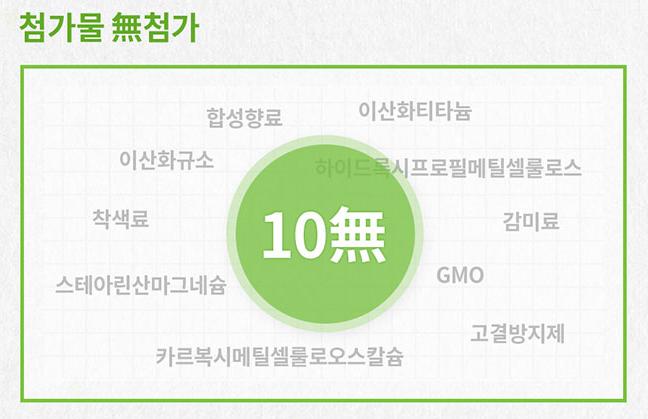 또한 소, 돼지, 생선 유래 젤라틴 등을 사용하지 않고 식물성 원료를 하였고 감미료, 착색료, 부형료 등 10가지의 첨가물을 첨가하지 않았다고 하니 안심하고 섭취할 수 있습니다 :)