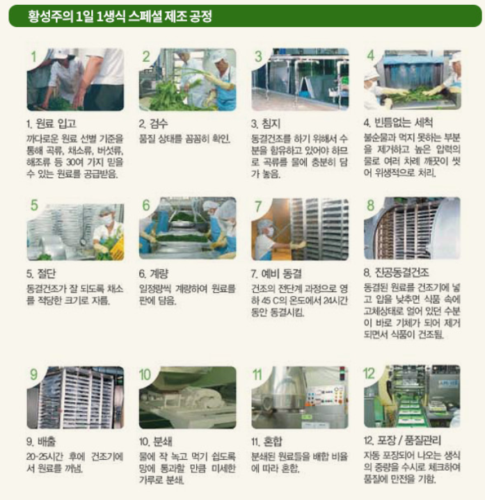 또한 황성주 생식은 제조할 때 동결건조 공법을 이용한다고 하는데요, 동결건조 공법은 영하 30도 이하의 온도에서 동결시킨 다음 진공상태에 가깝게 기압을 낮추고 낮은 온도에서 건조시켜서 수분을 제거하는 방법을 말합니다. 고온에서 재료들을 가공하면 열에 약한 성분들이 많이 파괴가 된다고 해요. 그래서 동결건조 공법을 이용하면 비타민, 미네랄, 엽록소 등의 영양소 파괴와 맛, 향 , 색 등의 변화를 최소화할 수 있다고 해요.