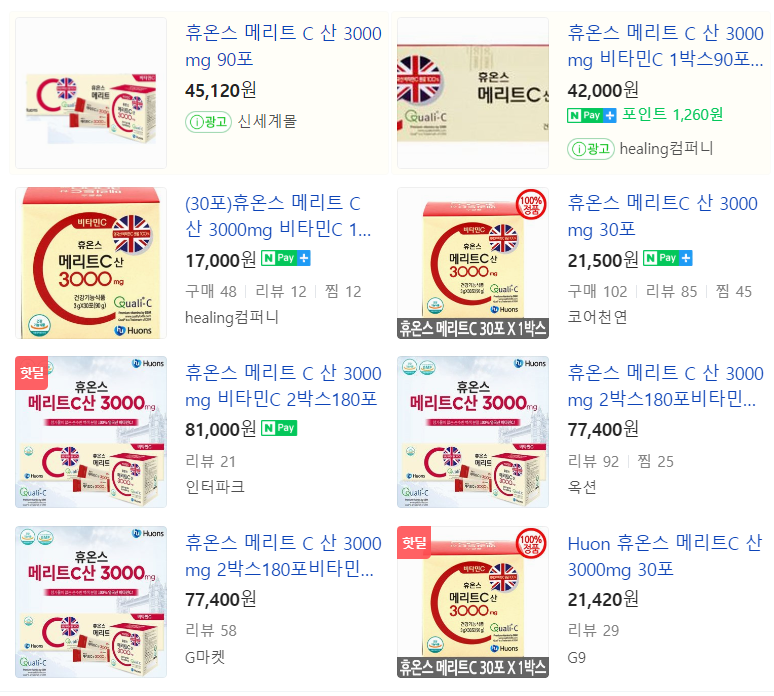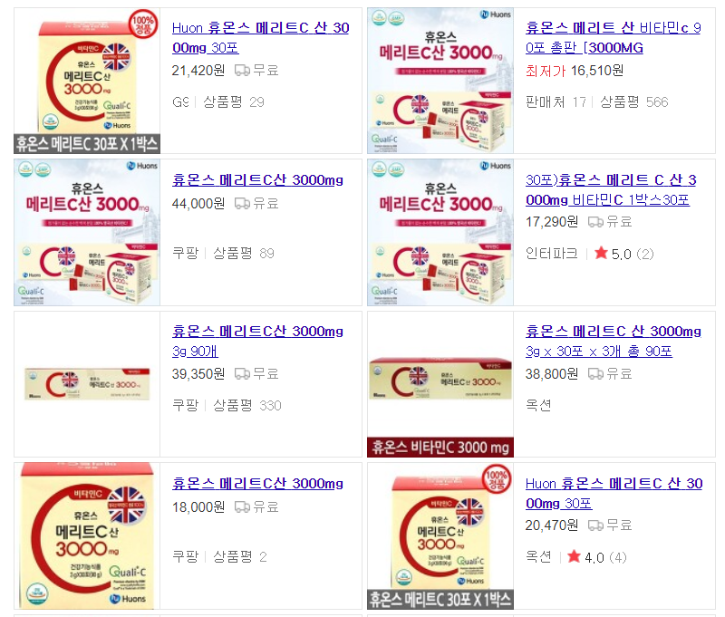 휴온스 메리트 C 산 3000mg는 현재 온라인 상에서 쉽게 구매하실 수 있는데요, 제가 알아본 가격으로는 30포 기준으로 16,000원 정도의 가격이 가장 저렴했고, 90포는 39,000원 정도의 가격이 가장 저렴했어요.