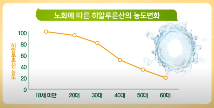 우리가 나이가 들면서 피부가 건조해지고 탄력이 떨어지는 것도 바로 히알루론산과 밀접한 관련이 있습니다. 그 이유는 점점 체내 히알루론산이 감소하기 때문인데요, 노화에 따른 히알루론산의 농도변화를 살펴보면 히알루론산은 약 20세 정도부터 점점 감소해서 4~50대가 되면 20세의 절반 정도까지 감소하게 됩니다. 그렇기 때문에 피부 건강을 위해서는 히알루론산을 꾸준히 섭취해주는 것이 좋습니다.