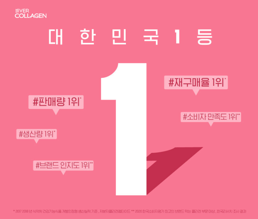 에버콜라겐은 현재 김사랑씨가 모델로 활동 중인 제품으로 김사랑 콜라겐으로도 많이 불리고 있는 것 같습니다ㅎㅎ 에버콜라겐은 현재 우리나라에서 판매량, 브랜드 인지도, 소비자 만족도, 생산량 그리고 재구매율까지 모두 1위를 달성하고 있는 제품이라고 해요. 저는 제품을 선택할 때 아무래도 한번 구매해본 사람이 재구매했다는 것은 어느정도 효과가 있기 때문에 다시 구매한다고 생각해서 재구매율을 꼭 확인해보는데요, 에버콜라겐은 재구매율이 무려 29%나 되더라고요!