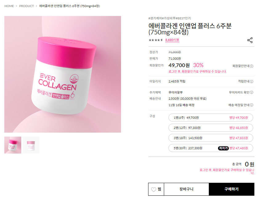 에버콜라겐 인앤업 플러스는 현재 뉴트리몰 공식 홈페이지에서 84정, 6주분을 49,700원에 판매 중이었어요.